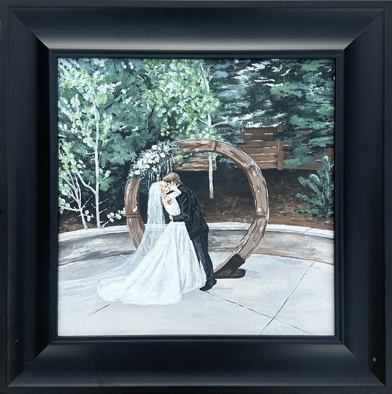 On the day of your wedding, Avery will arrive early to set up her painting station and begin creating! Guests love watching the painting come to life throughout the day. For guest minis, she and her assistant will photograph guests or take quick reference shots to paint from during and after the event.